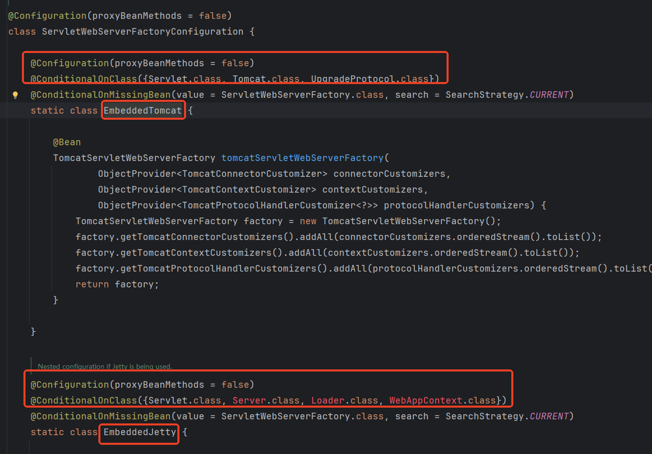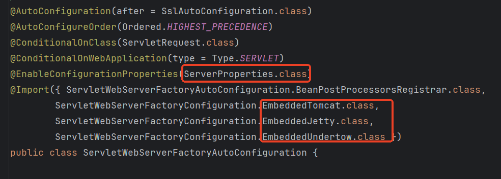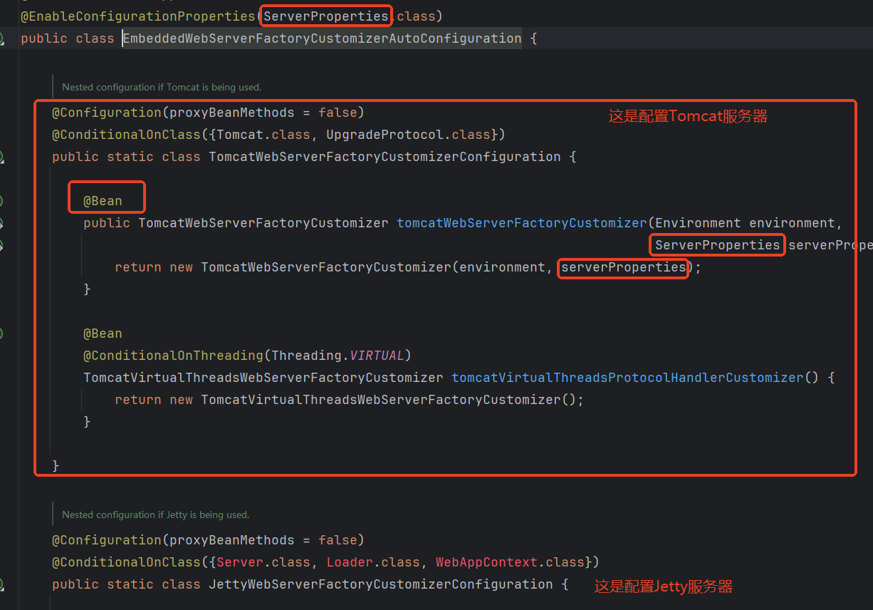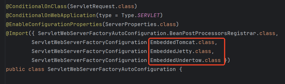 - 嵌入式的Tomcat、Jetty、Undertow容器。(web服务器本身就是几个jar包,Spring Boot框架自动嵌入了。)